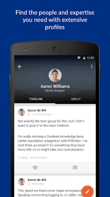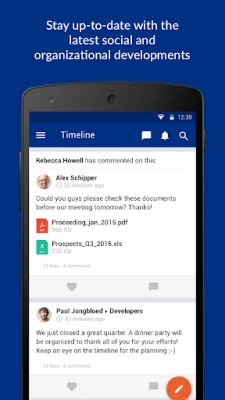 Share new knowledge, ideas and internal successes quickly and easily with the rest of your team, department or organization. Enrich messages with pictures, videos and emoticons. Simply keep track of new posts from your colleagues, organization and partners.